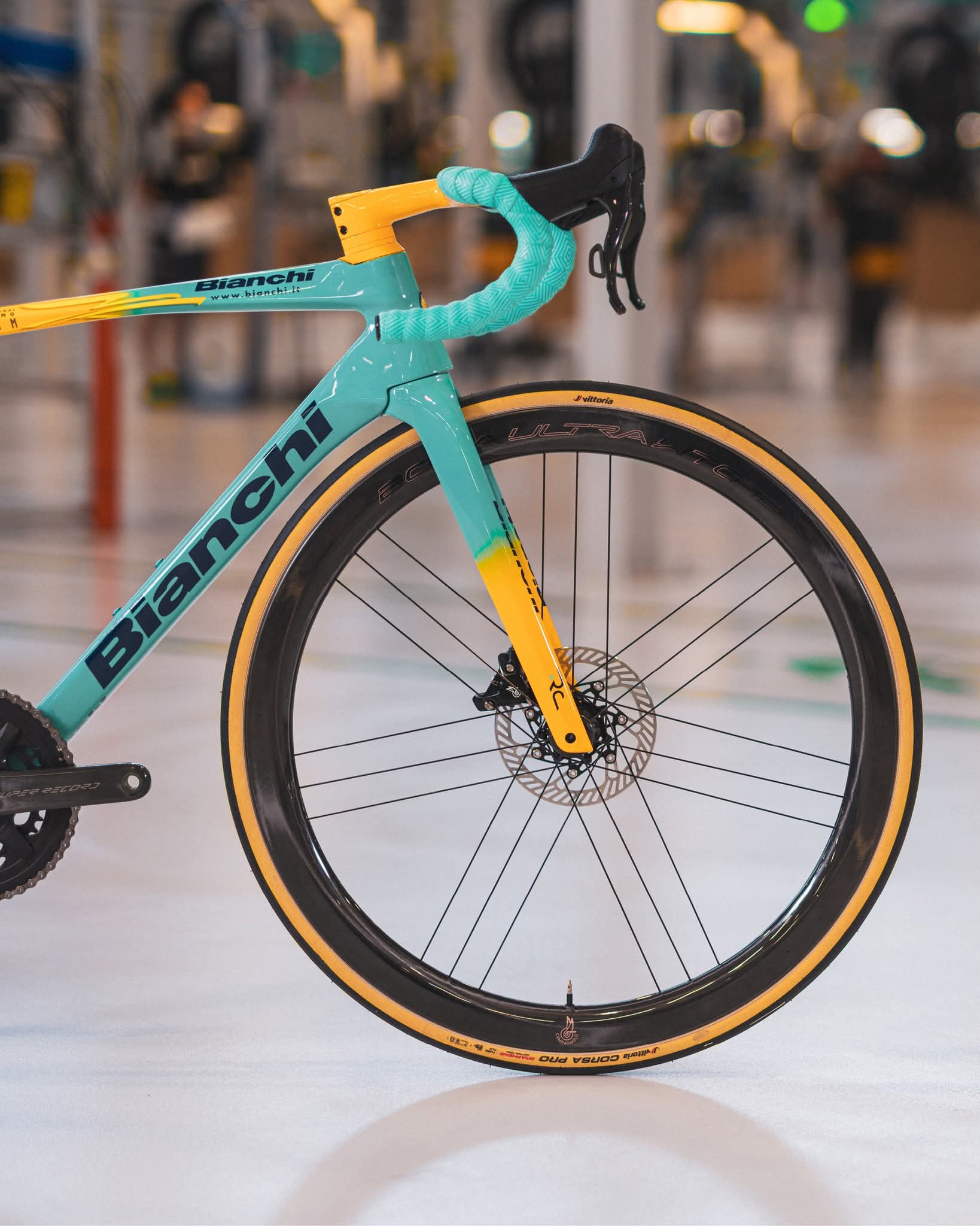 Created to honour Marco Pantani’s legendary 1998 Giro‑Tour double, this limited‑edition Specialissima RC pairs Bianchi’s lightest Countervail carbon frame with Campagnolo’s wireless Super Record WRL 2 × 13 gruppo. Racing graphics in Mercatone Uno yellow & blue and Pantani’s own autograph make every climb a tribute to “Il Pirata”. Limited to 215 units available world wide.