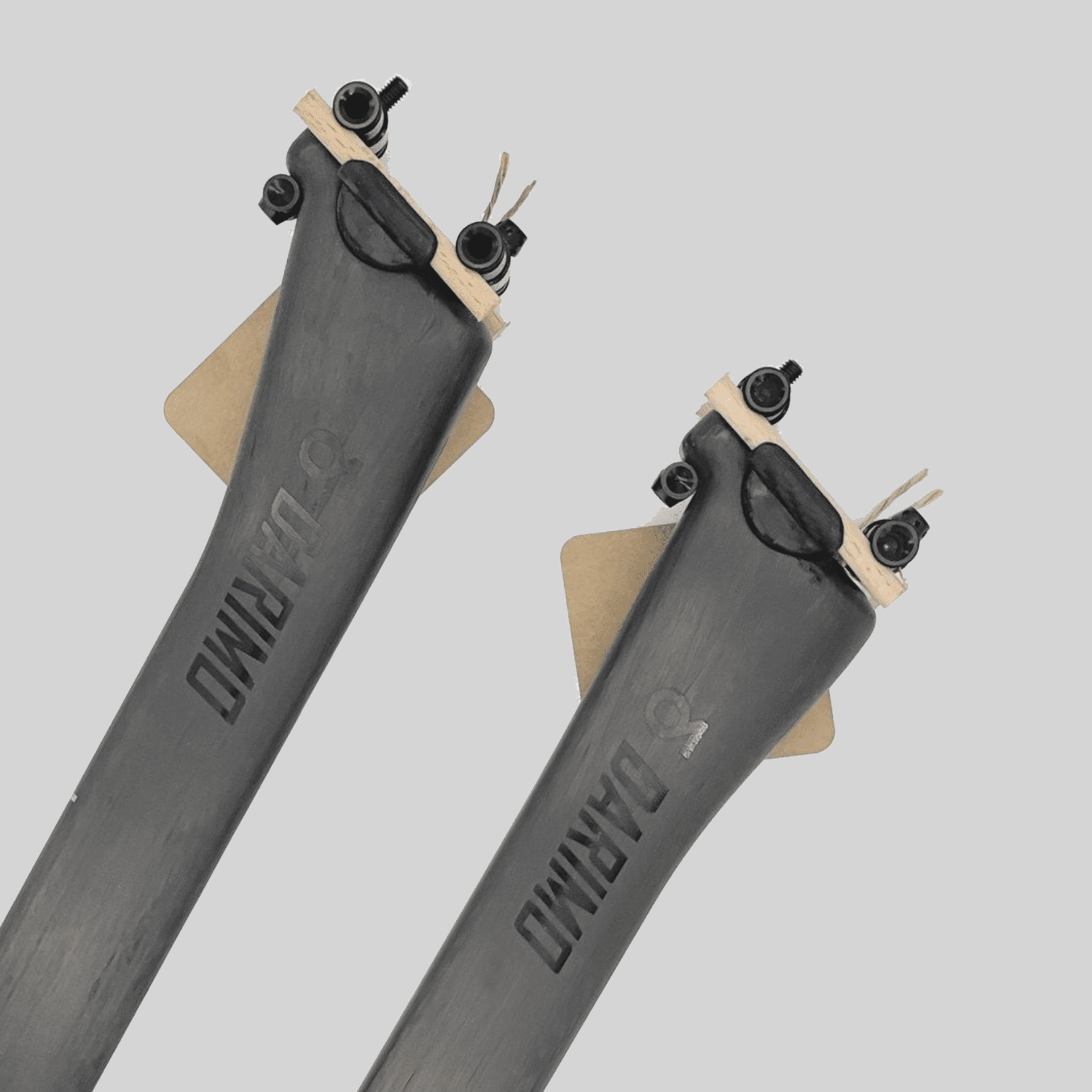 The totally new dessigned clamping system for the straight versions is made with two ultralight Dyneema® loops. That makes a very important weight reduction on the head of the seatpost / clamping system. This system is good for all kind of rails, including carbon rails 7*9mm.